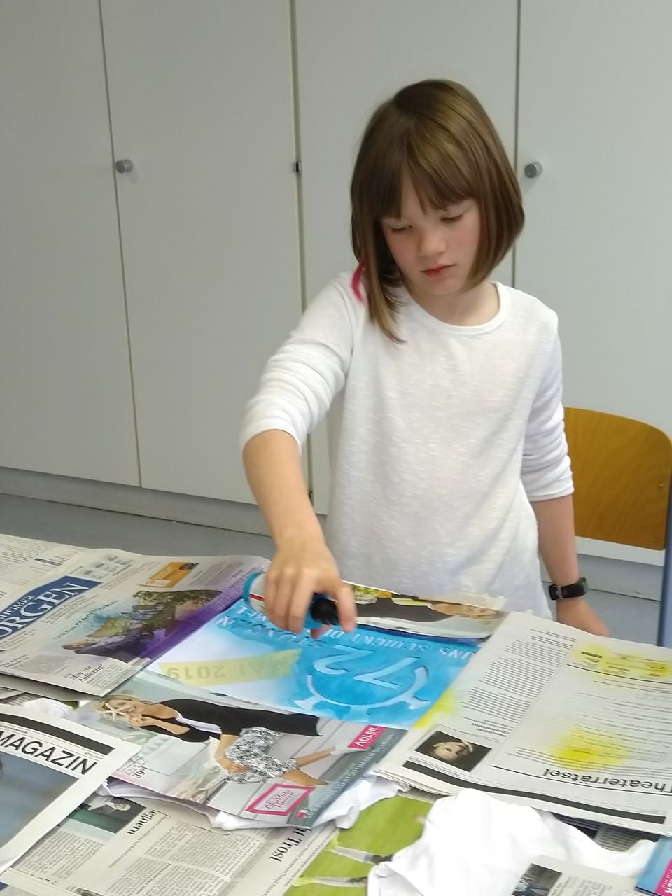 Am Montag haben die Kinder der dritten Klassen T-Shirts für die 72-Stunden-Aktion gemacht. Die Kinder hatten sehr viel Spaß, das hat man gesehen. Wir freuen uns, wenn Eltern und Geschwister mitmachen. (Carlotta, 3a)
